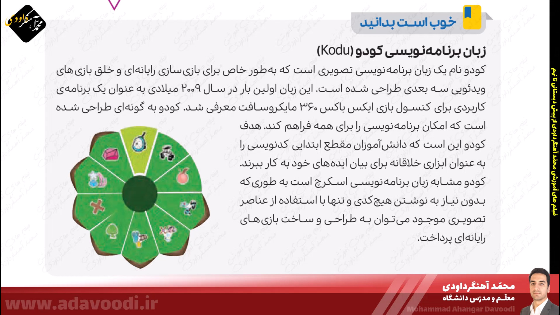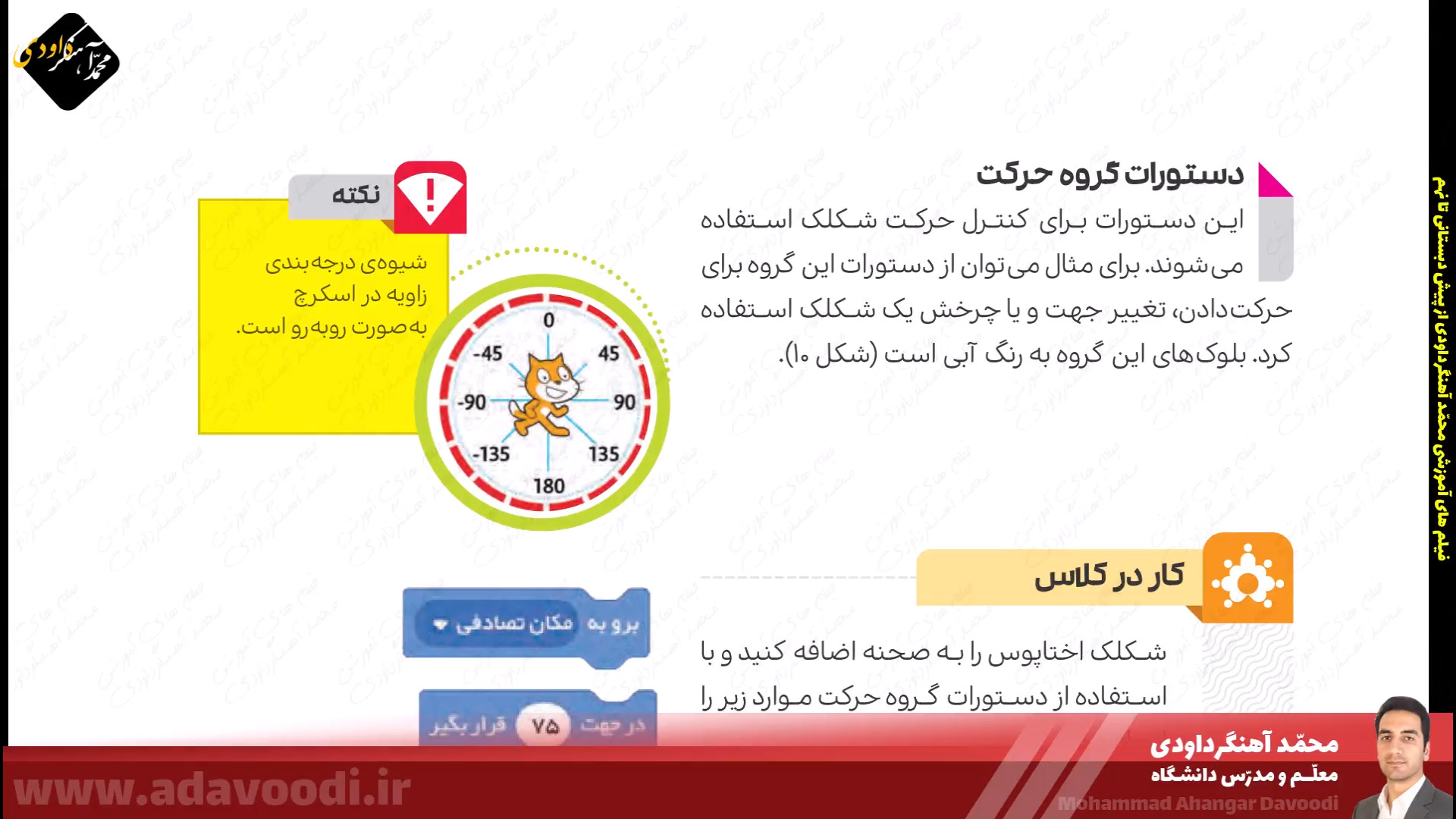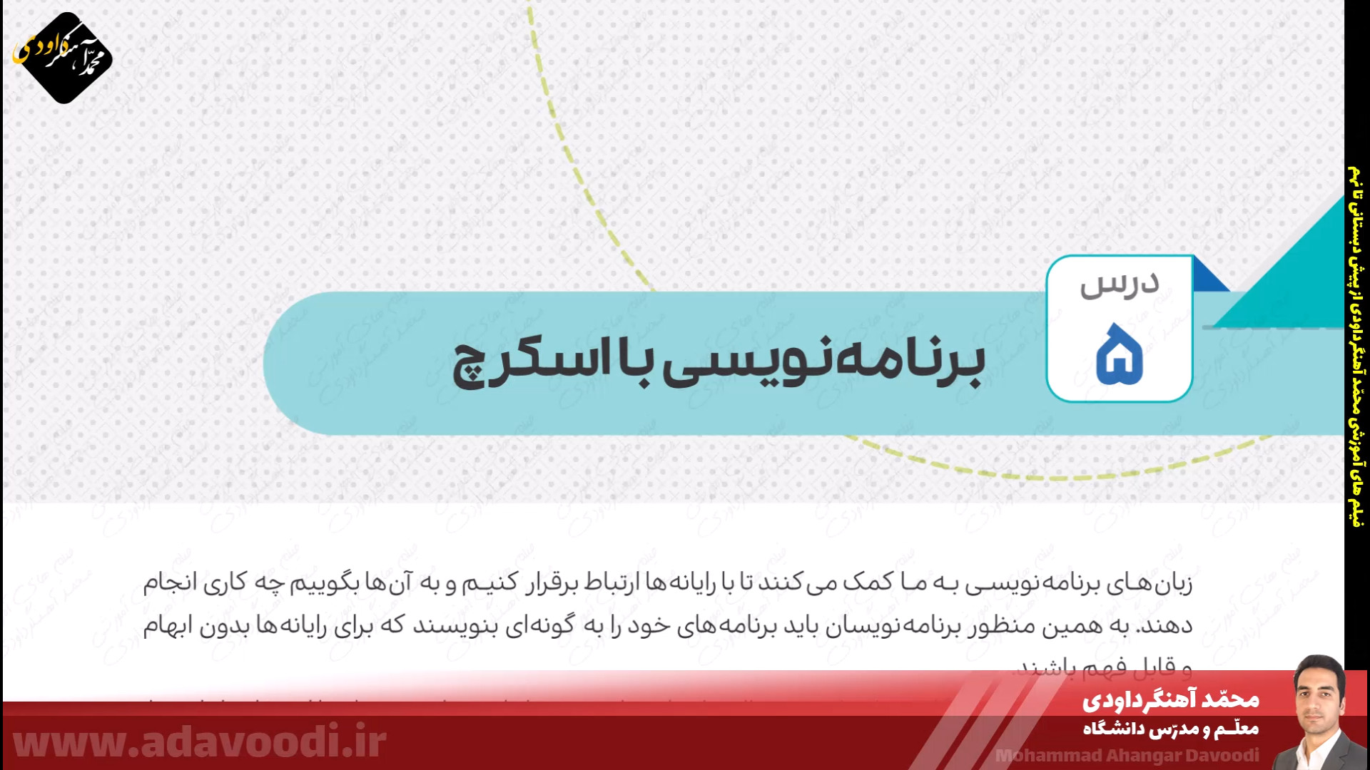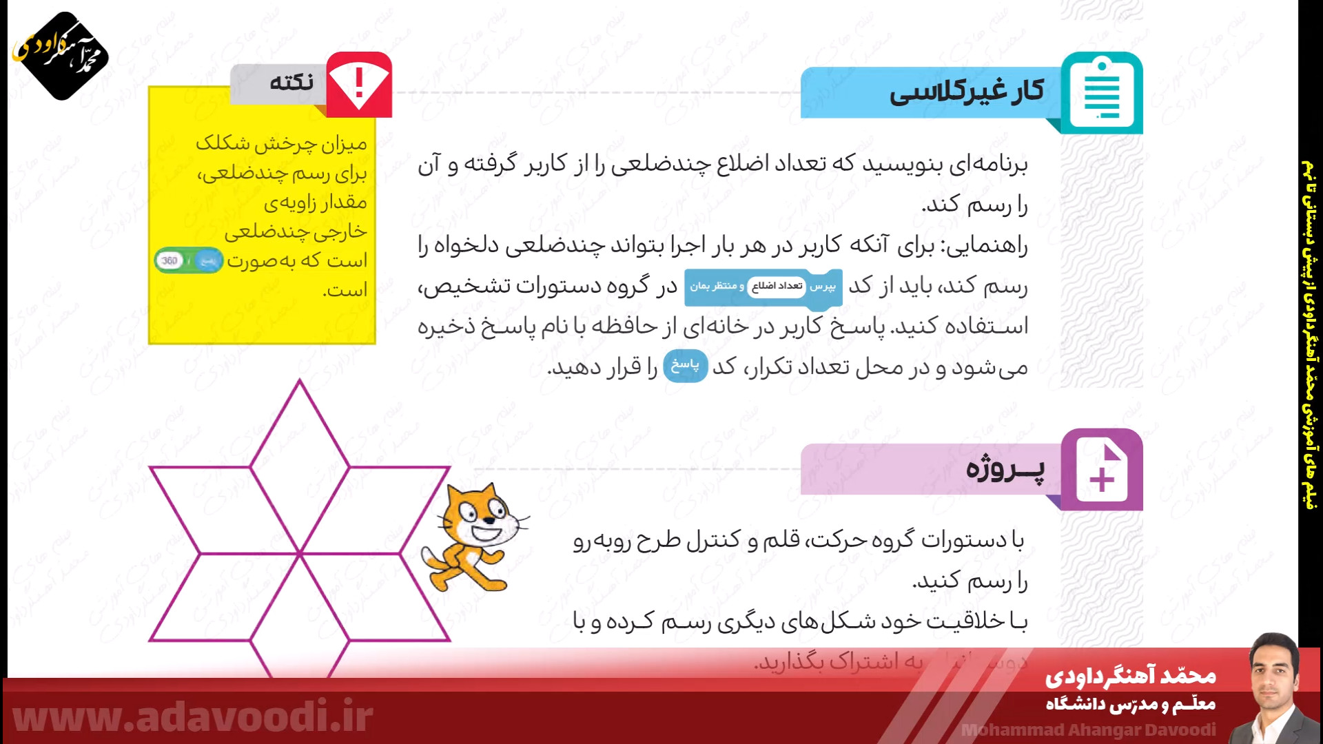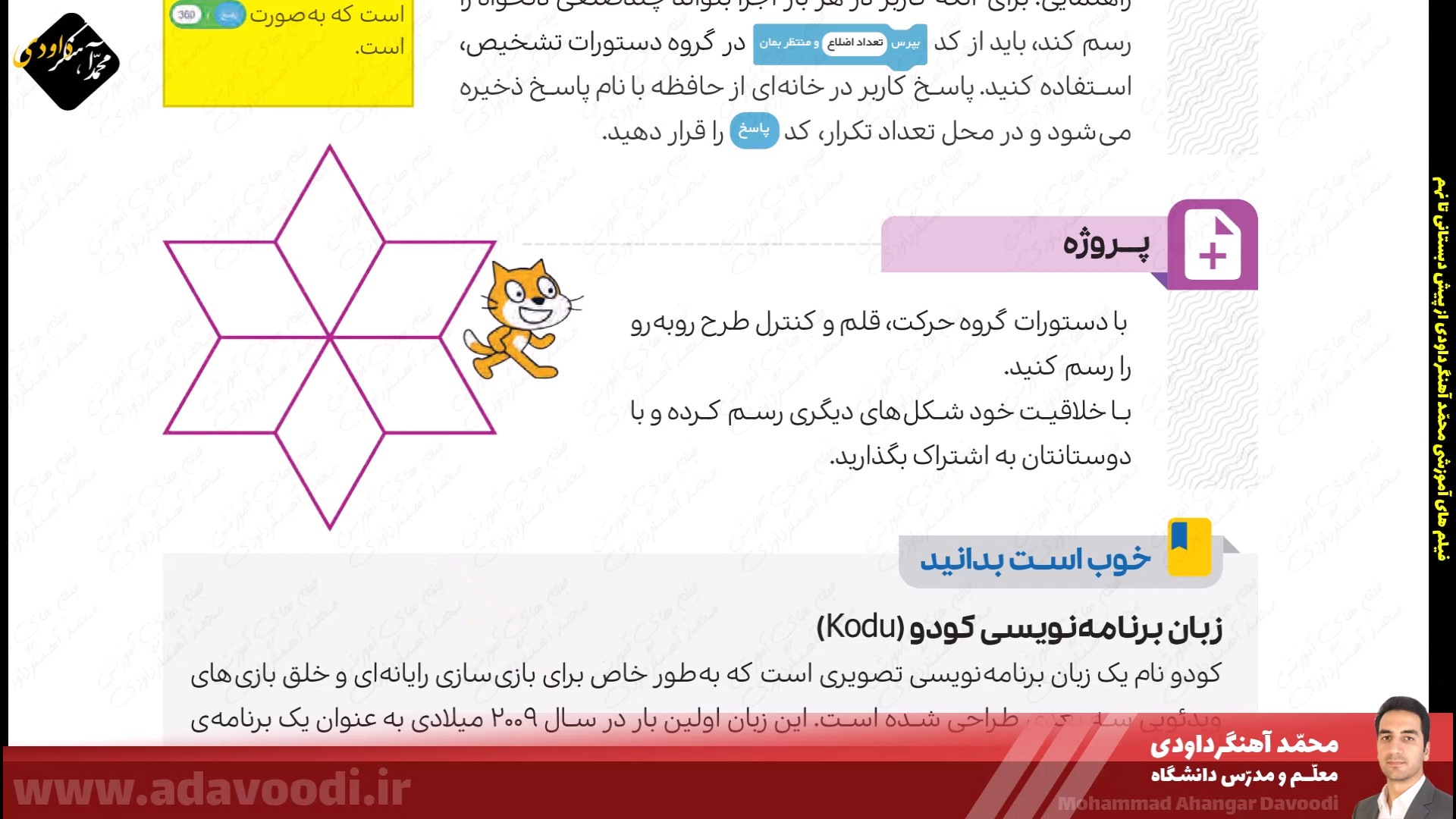 درس5 برنامه نویسی با اسکرچ بازگشت برنامه نویسی با اسکرچ نصب و برنامه ویژگی های اسکرچ آموزش نصب اسکرچ کار کلاسی صفحه60 دستورات صفحه62 بال زدن پرنده در اسکرچ دستورات گروه صدا در اسکرچ تمرین صفحه64 ساخت داستان تمرین صفحه64 داستان روباه و زاغ صفحه64 ساخت طبل صدادار کار غیرکلاسی صفحه64 ساخت برنامه قرآنی دستورات گروه حرکت آشنایی با دستورات افزونه ی قلم صفحه 67 دستورات گروه تشخیص و عملگرها ترسیم اشکال هندسی و کار در کلاس صفحه68 کار غیرکلاسی صفحه68 رسم چندضلعی دلخواه پروژه صفحه68 ترسیم 6 لوزی کنار هم زبان برنامه نویسی کودو kodu دستورات گروه متغیرها و ساخت برنامه زوج و فرد خروجی گرفتن exe و html از اسکرچ ساخت بازی با اسکرچ فعالیت اوّل صفحه72 فعالیت دوم صفحه72 میان درس اینترنت و شبکه جهانی وب