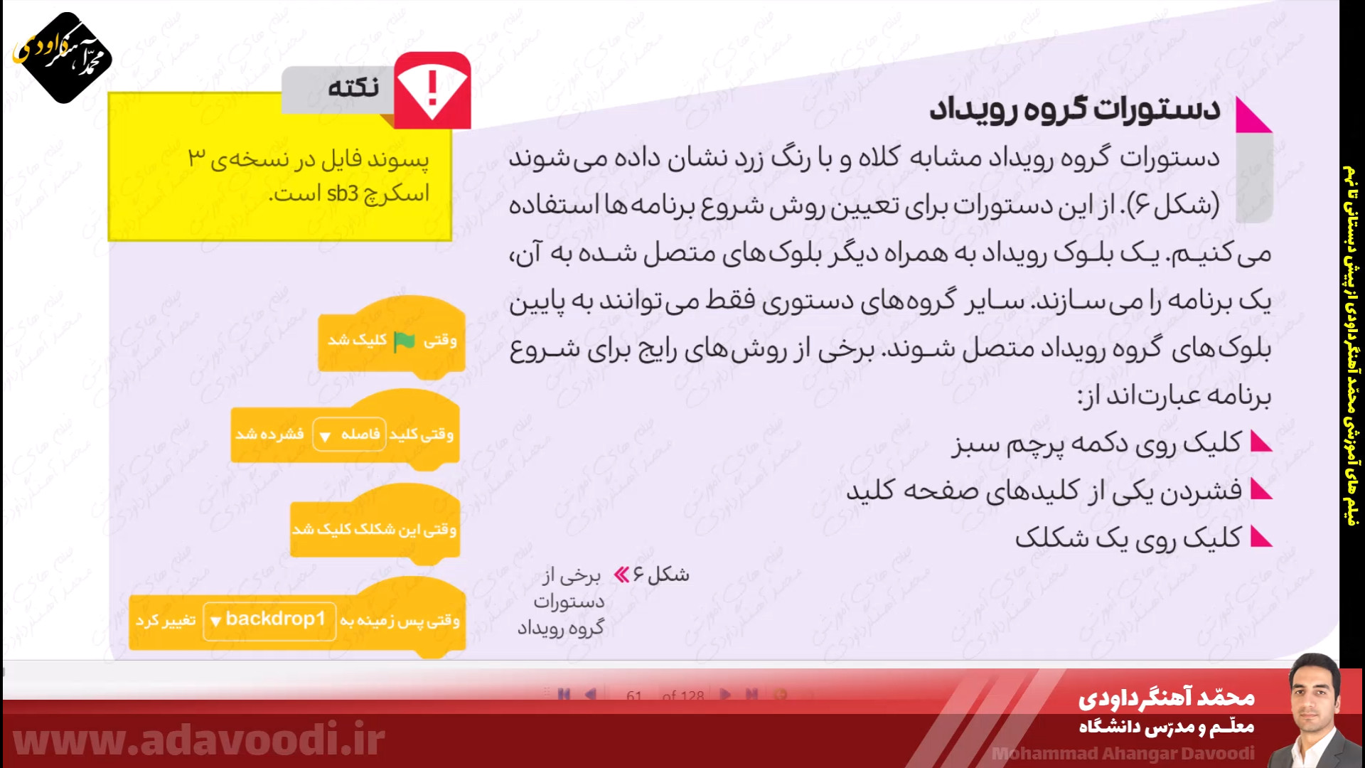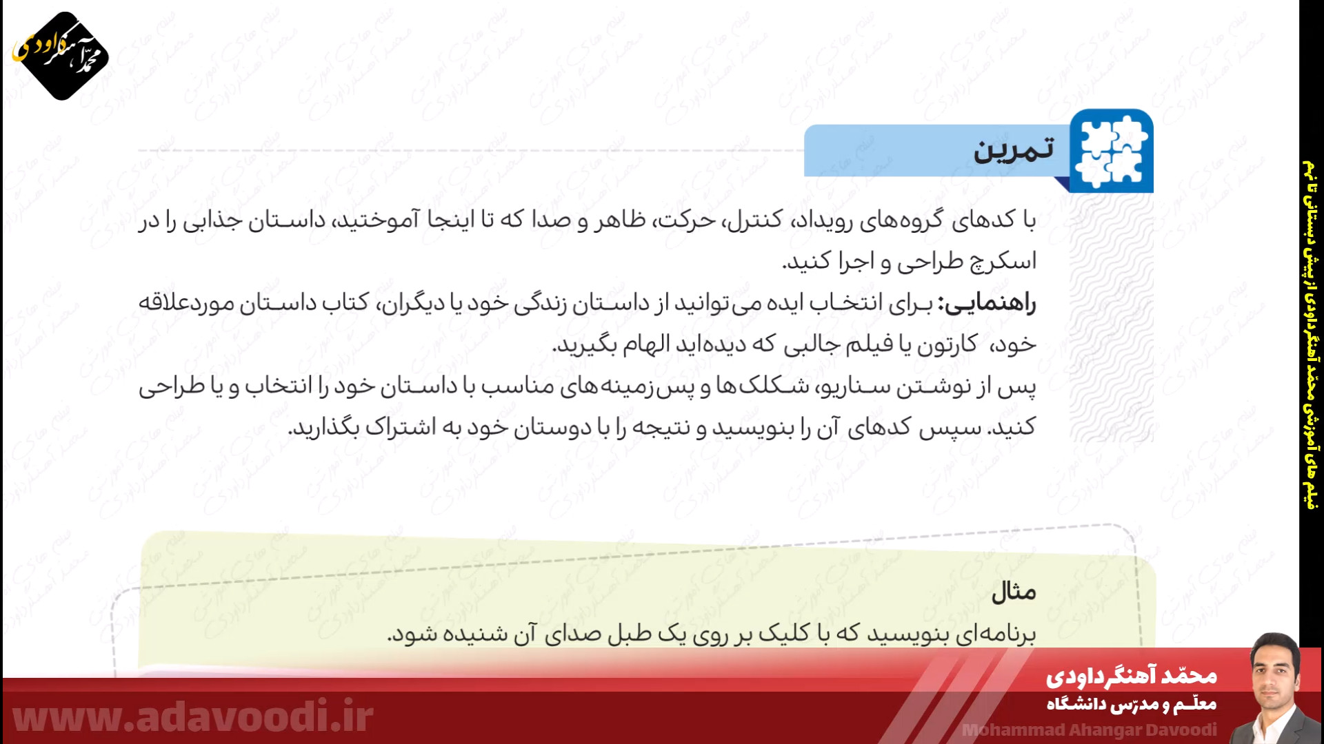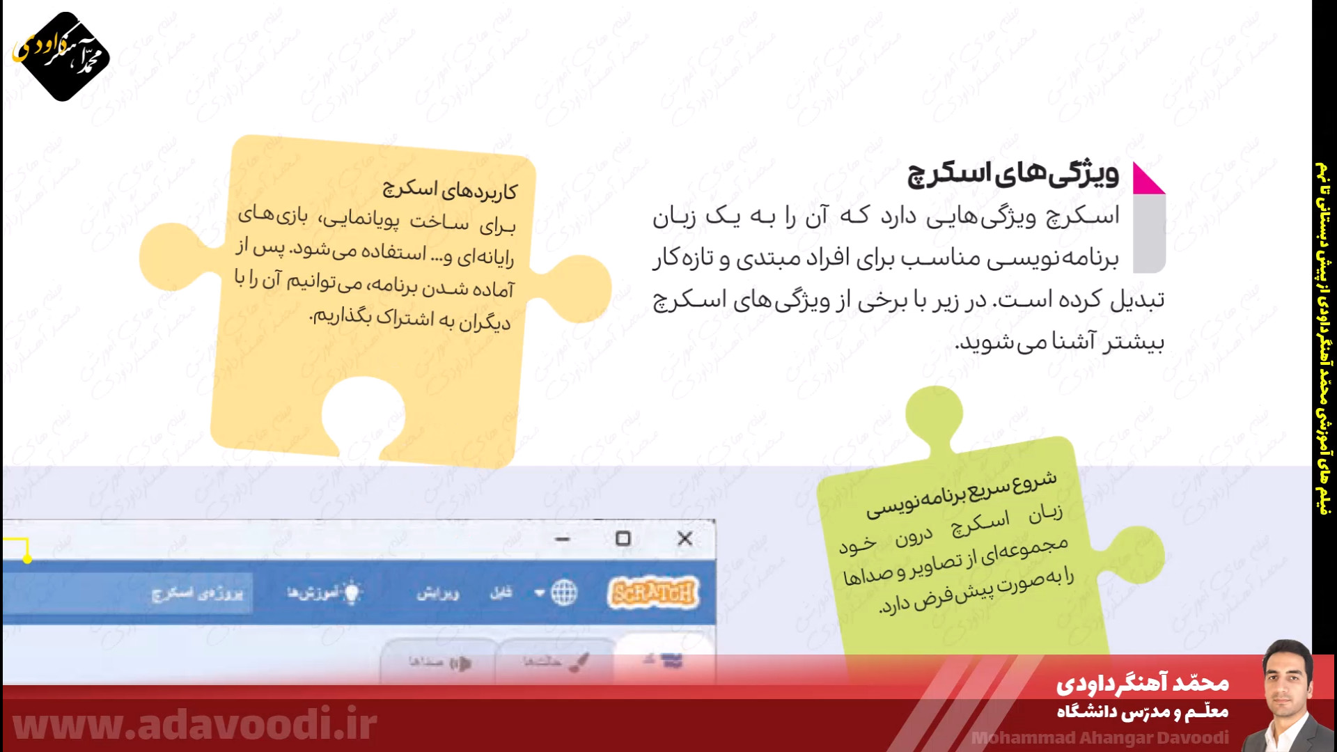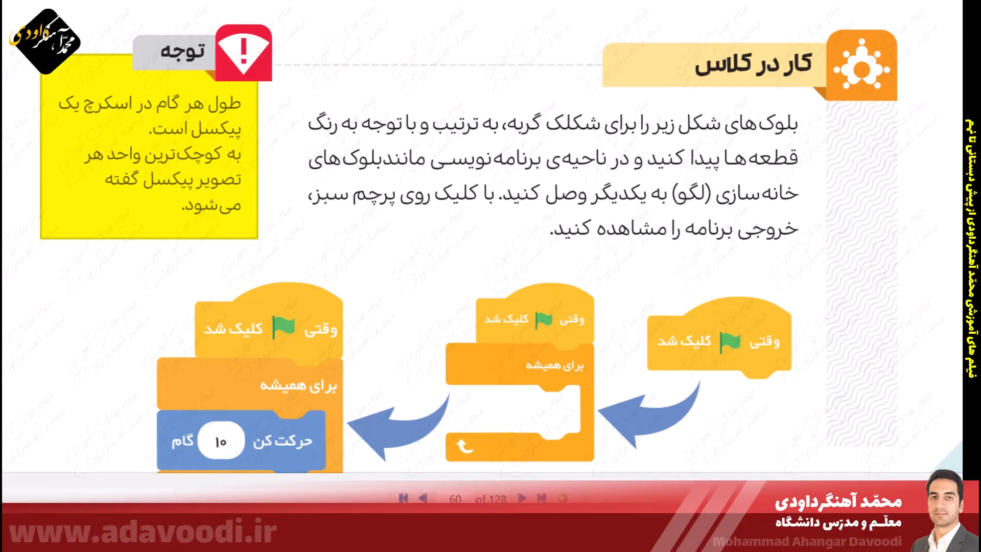 درس5 برنامه نویسی با اسکرچ بازگشت برنامه نویسی با اسکرچ نصب و برنامه ویژگی های اسکرچ آموزش نصب اسکرچ کار کلاسی صفحه60 دستورات صفحه62 بال زدن پرنده در اسکرچ دستورات گروه صدا در اسکرچ تمرین صفحه64 ساخت داستان تمرین صفحه64 داستان روباه و زاغ صفحه64 ساخت طبل صدادار کار غیرکلاسی صفحه64 ساخت برنامه قرآنی دستورات گروه حرکت آشنایی با دستورات افزونه ی قلم صفحه 67 دستورات گروه تشخیص و عملگرها ترسیم اشکال هندسی و کار در کلاس صفحه68 کار غیرکلاسی صفحه68 رسم چندضلعی دلخواه پروژه صفحه68 ترسیم 6 لوزی کنار هم زبان برنامه نویسی کودو kodu دستورات گروه متغیرها و ساخت برنامه زوج و فرد خروجی گرفتن exe و html از اسکرچ ساخت بازی با اسکرچ فعالیت اوّل صفحه72 فعالیت دوم صفحه72 میان درس اینترنت و شبکه جهانی وب