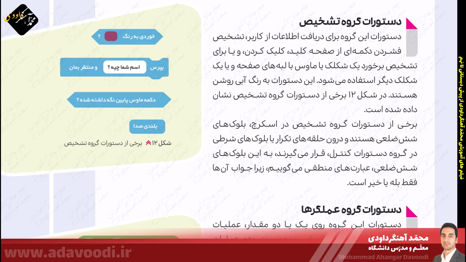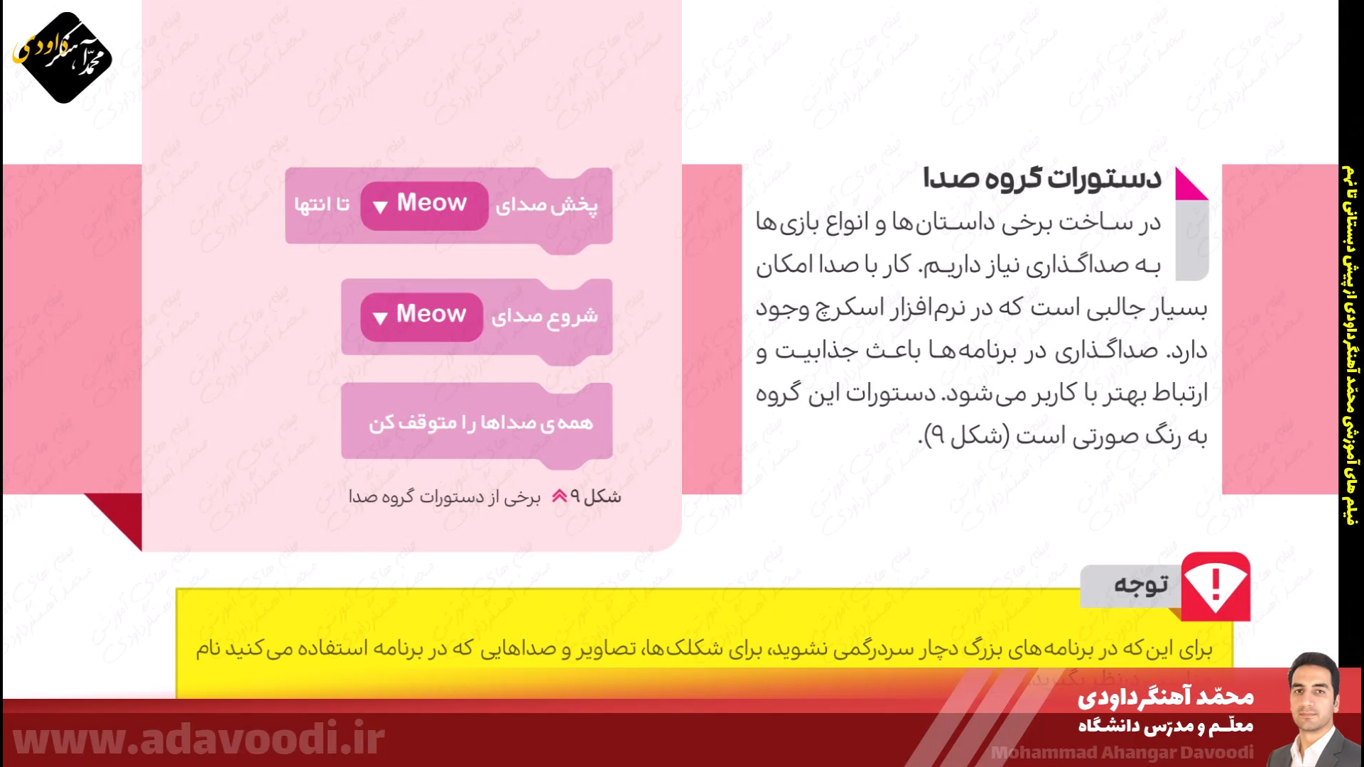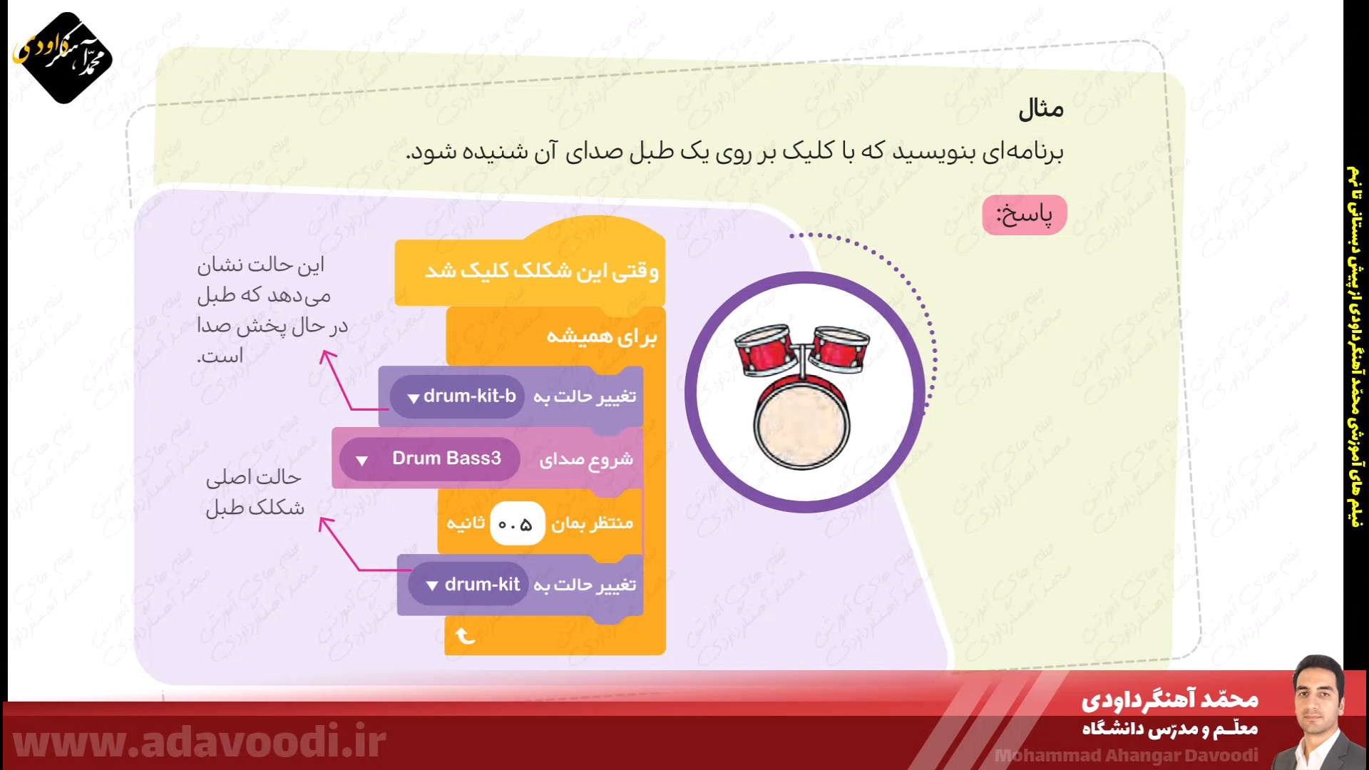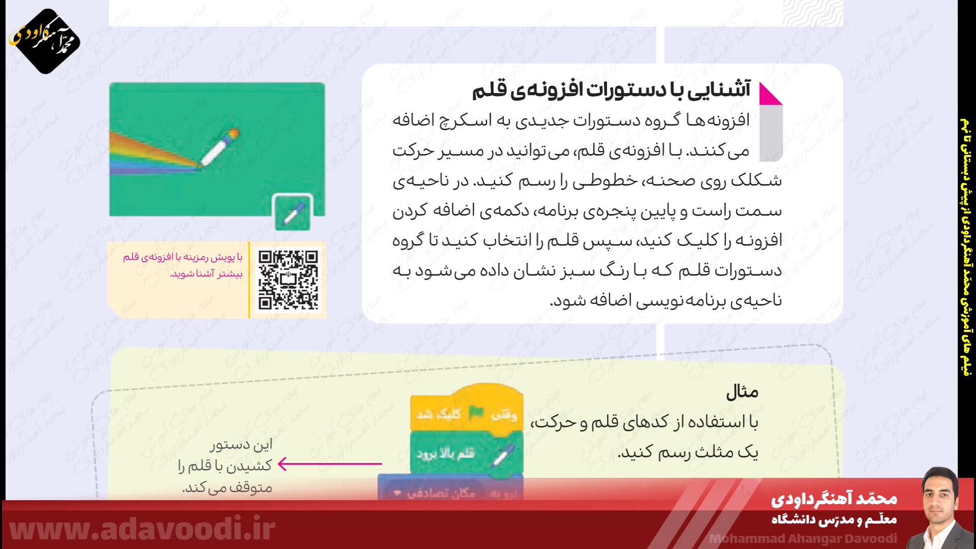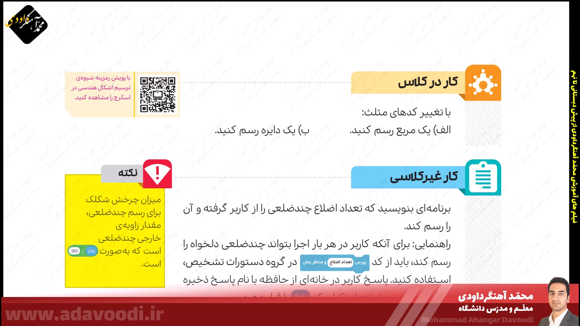 درس5 برنامه نویسی با اسکرچ بازگشت برنامه نویسی با اسکرچ نصب و برنامه ویژگی های اسکرچ آموزش نصب اسکرچ کار کلاسی صفحه60 دستورات صفحه62 بال زدن پرنده در اسکرچ دستورات گروه صدا در اسکرچ تمرین صفحه64 ساخت داستان تمرین صفحه64 داستان روباه و زاغ صفحه64 ساخت طبل صدادار کار غیرکلاسی صفحه64 ساخت برنامه قرآنی دستورات گروه حرکت آشنایی با دستورات افزونه ی قلم صفحه 67 دستورات گروه تشخیص و عملگرها ترسیم اشکال هندسی و کار در کلاس صفحه68 کار غیرکلاسی صفحه68 رسم چندضلعی دلخواه پروژه صفحه68 ترسیم 6 لوزی کنار هم زبان برنامه نویسی کودو kodu دستورات گروه متغیرها و ساخت برنامه زوج و فرد خروجی گرفتن exe و html از اسکرچ ساخت بازی با اسکرچ فعالیت اوّل صفحه72 فعالیت دوم صفحه72 میان درس اینترنت و شبکه جهانی وب